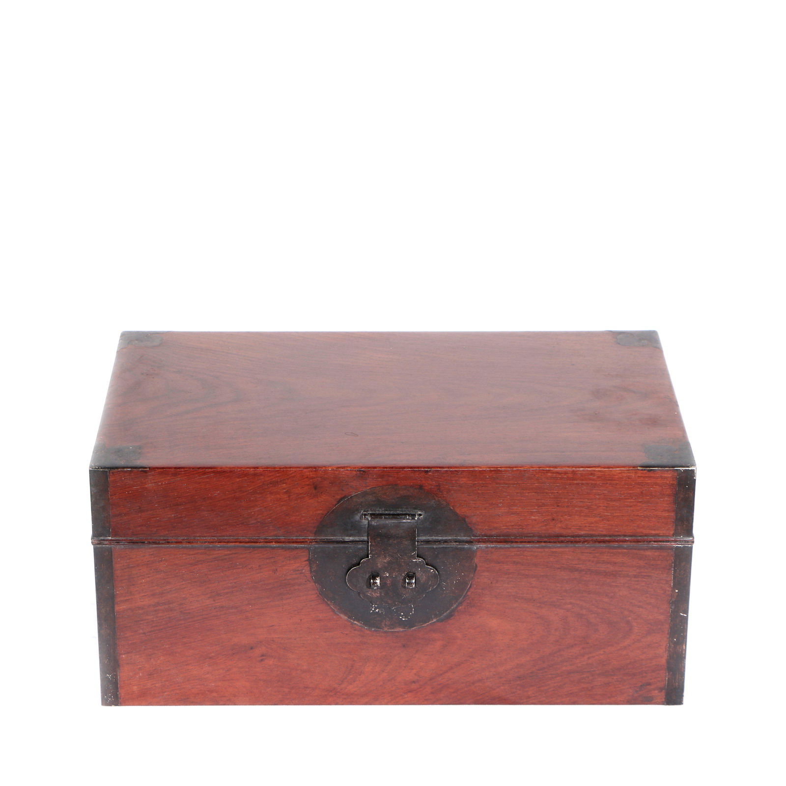 VINTAGE CHINESE HARDWOOD JEWELRY BOX WITH BRASS FITTINGS