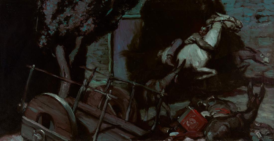 SoldHarold von Schmidt (American, 1893-1982) Josie Belle's Hands Levered at His Armpits, Dragging HimHarold von Schmidt (American, 1893-1982) Josie Belle's Hands Levered at His Armpits, Dragging Him Toward the Door, c. 1940s oil on canvas signed Harold von Schmidt and dated illegibly (lower left); tiSee Sold Price