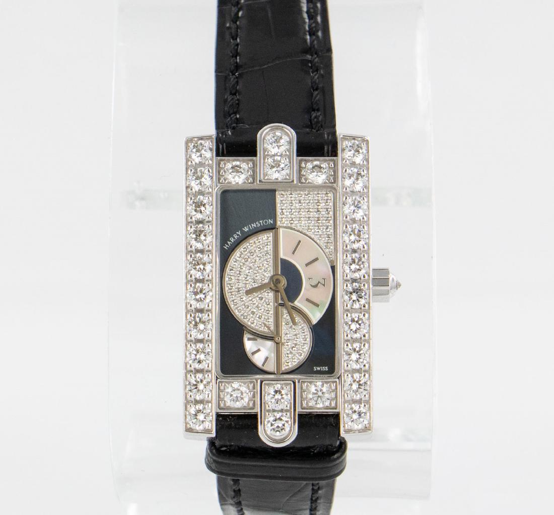 SoldHarry Winston Ladies' Diamond WatchHarry Winston 18K diamond ladies' Avenue C collection watch. Diamonds weight approx. 1.75ct. Mother of pearl dial, white crocodile band and deployment buckle, back of watch signed Harry Winston and trSee Sold Price