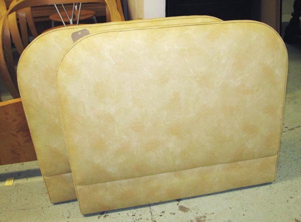 Sold(2) TWIN TONAL GOLD UPHOLSTERED HEADBOARDS(pair) Twin upholstered headboards, padded and covered in tonal gold fabric, affixed with fancy gilt metal tacks, approx 60"h, 40"w Start Price: $50.00See Sold Price