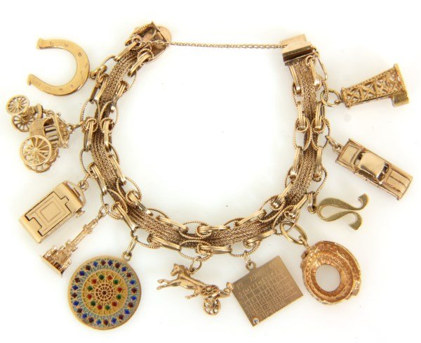 Vintage Estate Mixed Jewelry Lot, Gold-Plated More, 9 Pieces, 63.68 GramsEight Charms Link Bracelet 14kt gold 7.5 inch 14gm**Eight Charms Link Bracelet 14kt gold 7.5 inch 14gm**Nine Charms Link Bracelet 14kt gold 7 inch 54gm**Nine Charms Link Bracelet 14kt gold 7 inch 54gm**Eight Charms Link Bracelet 14kt gold 7 inch 43gm**Eight Charms Link Bracelet 14kt gold 7 inch 43gm**14kt Gold 6 Charm Functional Bracelet Sun Dog Windmill Frame Lilly 104gr**Vintage 1950's Pearl Shoes Hat Police Charm Bracelet 14K Yellow Gold, 59.27 Gram14K Gold Charm Bracelet6 days Left14K gold charm bracelet with 18 charms, including animals and other objects of travel. 6 charmsMar 01, 202614K gold charm bracelet with 18 charms, including objects from travel, teapots, lanterns,Mar 01, 2026A collection of antique and vintage jewellery,4 days LeftVintage 14k Gold Charm Bracelet with 17 Assorted Collectible Charms3 days LeftVintage 14k Gold Charm Bracelet with 17 Assorted Collectible Charms7 days Left14K CHARM BRACELET WITH (11) GOLD CHARMS, MOST 14KMar 05, 2026