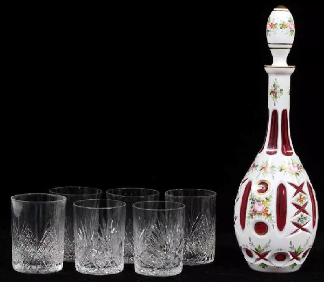 SoldRuby Glass Decanter and 4 Glasses w/ Silver OverlaBohemian, late 19th / early 20th century A ruby glass with silver overlay decanter with four tumblers Unmarked Approx. h. 10.75” (decanter); h. 3.75” (glass) Provenance: From the Lifetime CollectiSee Sold Price