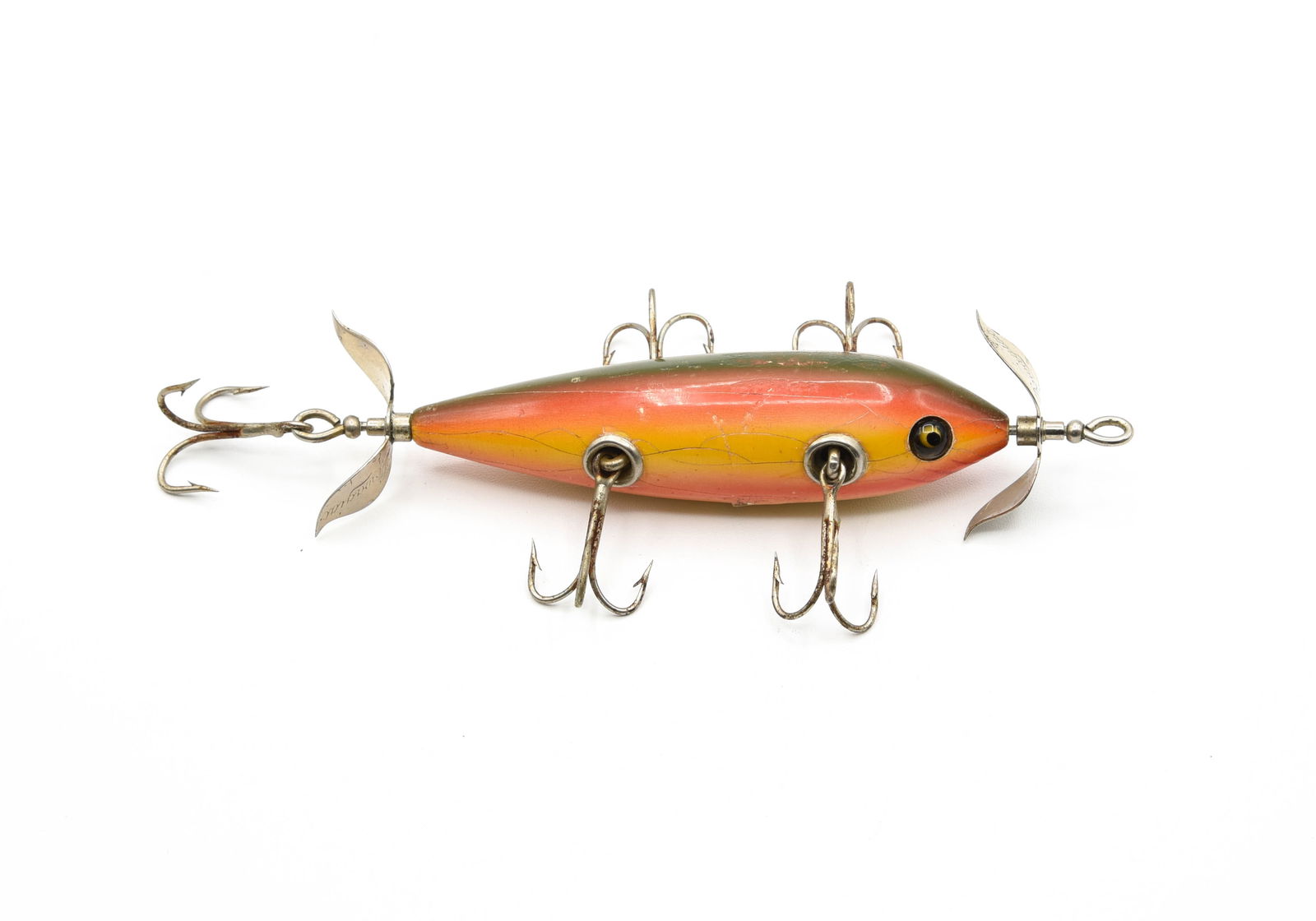 SoldHeddon 150 Underwater MinnowIn green crackleback with red hand painted gill marks, marked spinners, good glass eyes and cup rigging, if not for the varnish having been removed this early minnow would grade Ex-/Ex. Coming in itsSee Sold Price