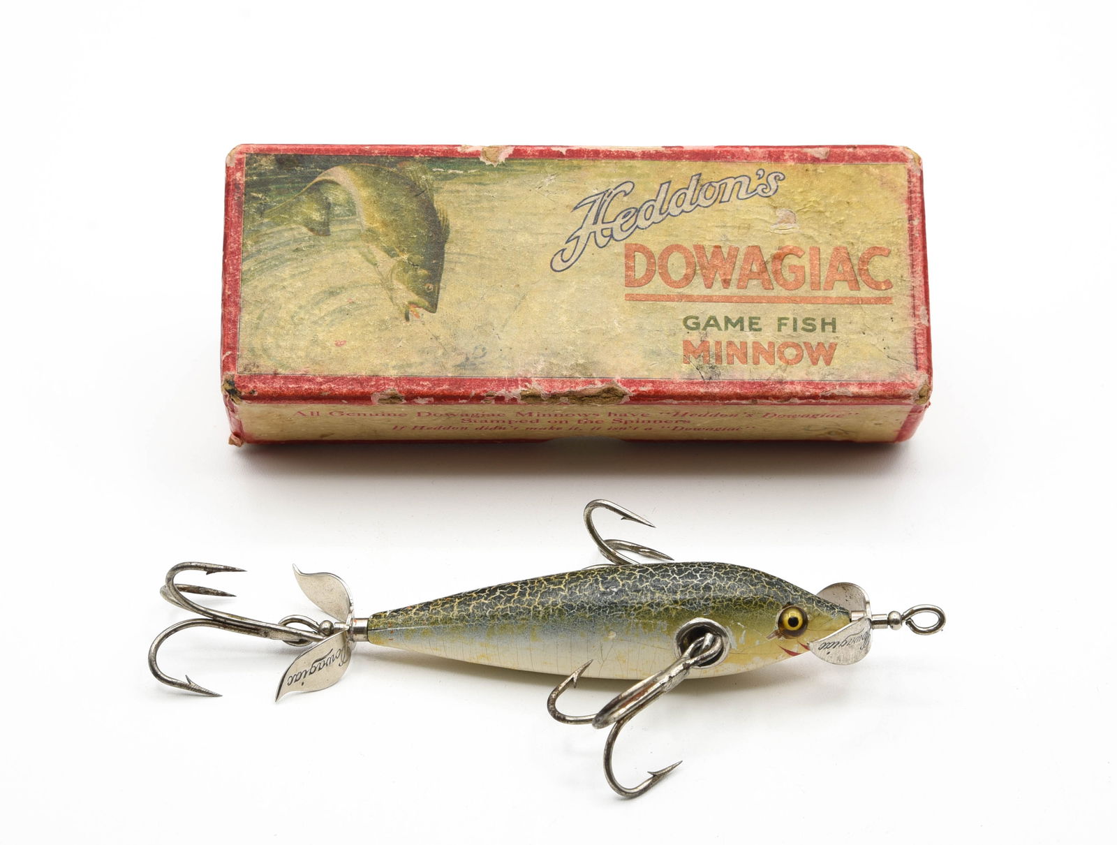 SoldHeddon Light Casting MinnowEarly small body style, 2 3/4", with delicate fish shaped tail, marked prop, fly dressed rear hook, and finished in yellow with spots. VG+/Ex-, with light wear, common flakes, hairline and age lines.See Sold Price