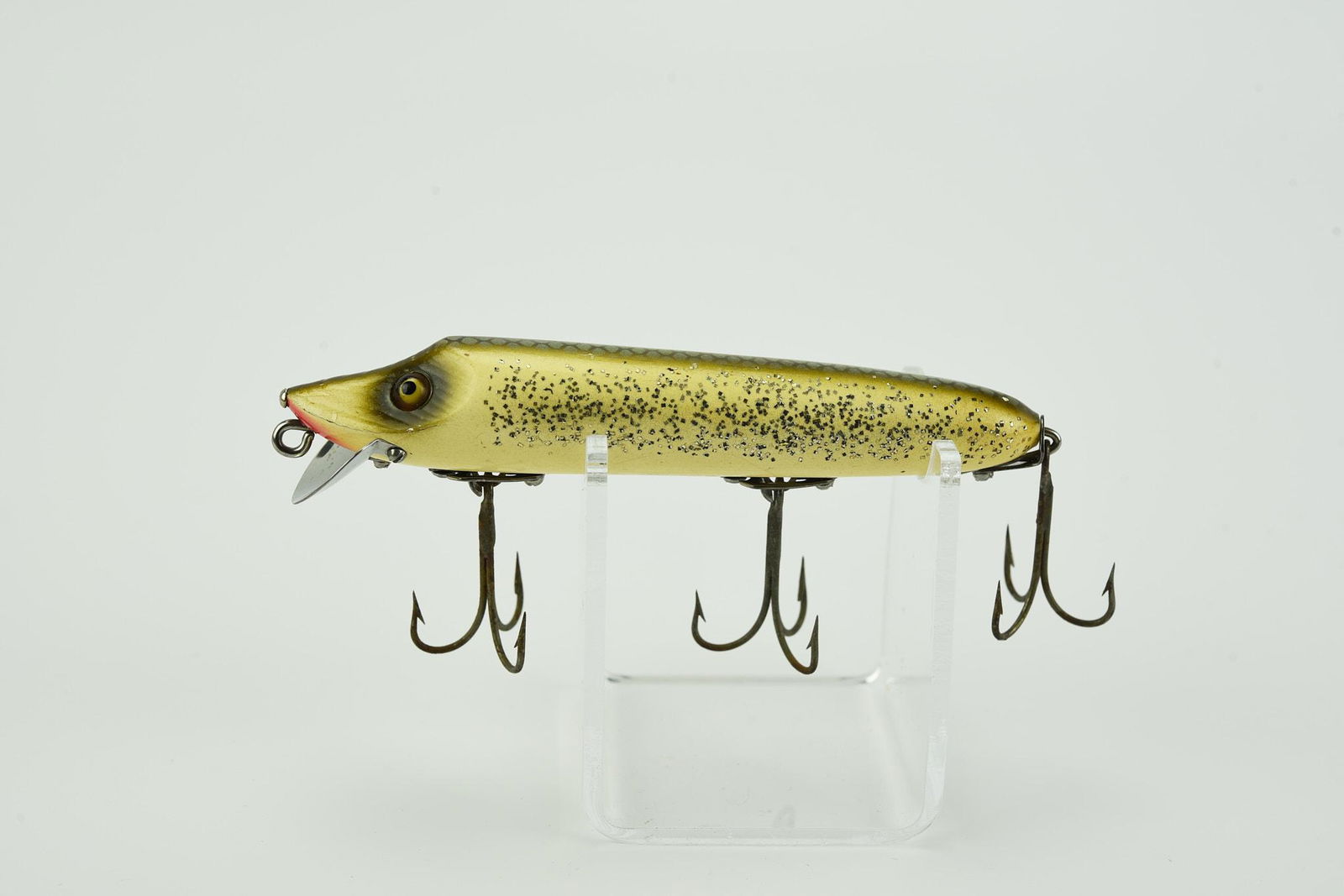 SoldHeddon 7559R Musky VampFinished in later natural scale, 6" model is rigged with heavy duty toilet seat hardware, large glass eyes, Heddon Vamp belly stencil and Stoley tail hook hanger. VG/VG+ condition due to heavy age linSee Sold Price