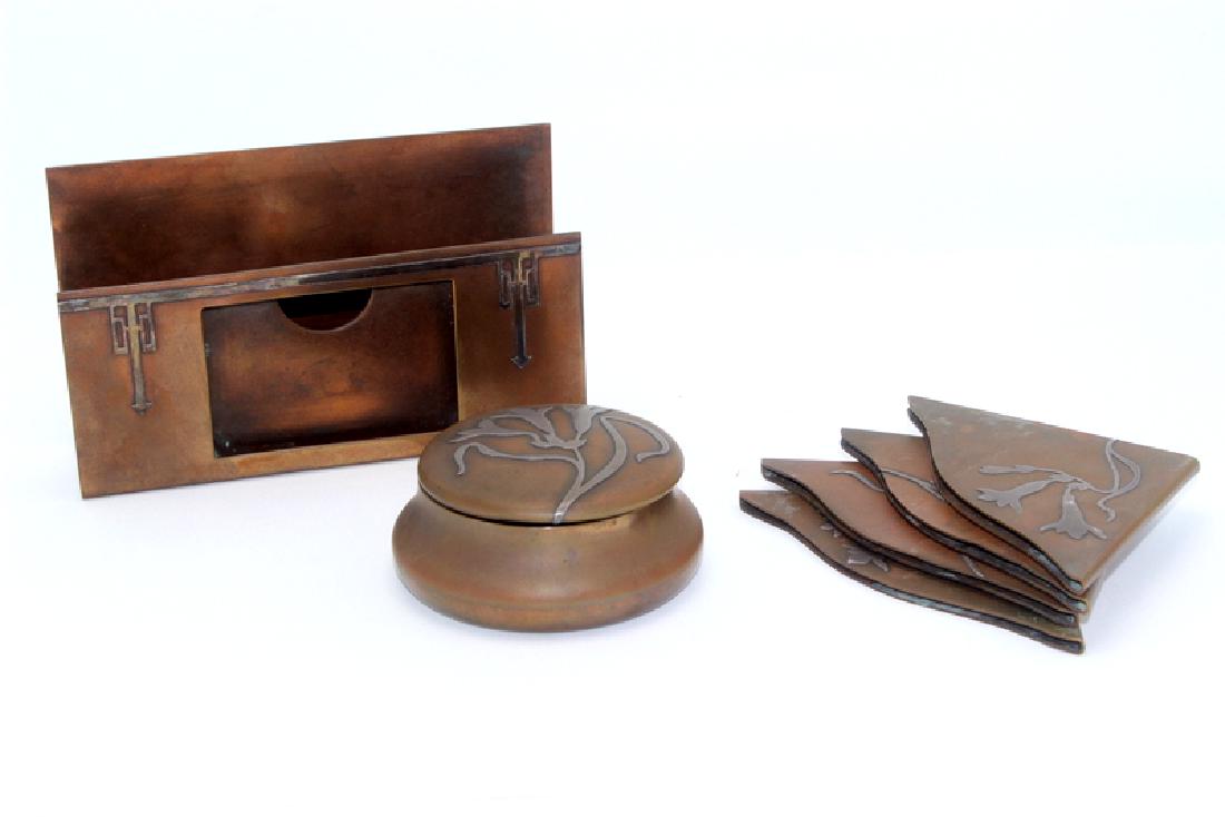 Lot of Silver AccessoriesMar 21, 2026ANTIQUE BRONZEWARE, INKWELLS, CHAMBERSTICK ETC.5 days Left19th C. English Brass Tea Caddy & French Pewter Tea Box5 days LeftAntique Wood Clerk's Writing Desk & Brass LampTWO ANTIQUE WOODEN DESK BOXES / CASKET5 days LeftLot of 5 Chinese Display Stands - 2 Brass & 3 Carved Hardwood Bases for Vases BonsaiVintage Tiffany Studios NY Stamped 1762 1753 1756 Chinese Bronze Desk SetMar 11, 2026Heintz Art Metal Shop Desk Set Wedgwood Plaques Sterling over Bronze5 days LeftTIFFANY STUDIOS Five-Piece 'Zodiac' Desk Set, circa 19153 days Left5 Piece Tiffany Studios New York Gilt Bronze Desk Set in Zodiac circa 1900Mar 15, 2026TIFFANY STUDIOS Five-Piece 'Graduate' Desk Set, circa 19153 days LeftArts & Crafts desk pieces, hammered copper Roycroft round ashtray, 6.75", Pair Silver Crest sterlingMar 09, 2026TIFFANY STUDIOS "AMERICAN INDIAN" PATTERN DESK SET BRONZE, BLOTTER, INK POT, PEN TRAY, LETTER HOLDERMar 15, 2026Group of Victorian Brass and Metal Desk Accessories Including Inkstand, Letter Opener, Book Clip andVictorian Brass Embossed Letter Holder, Part of Desk Set (11" x 12") AND Continental Jewelry CasketMar 10, 2026Vintage bronze desk top ink well with patina6 days Left
