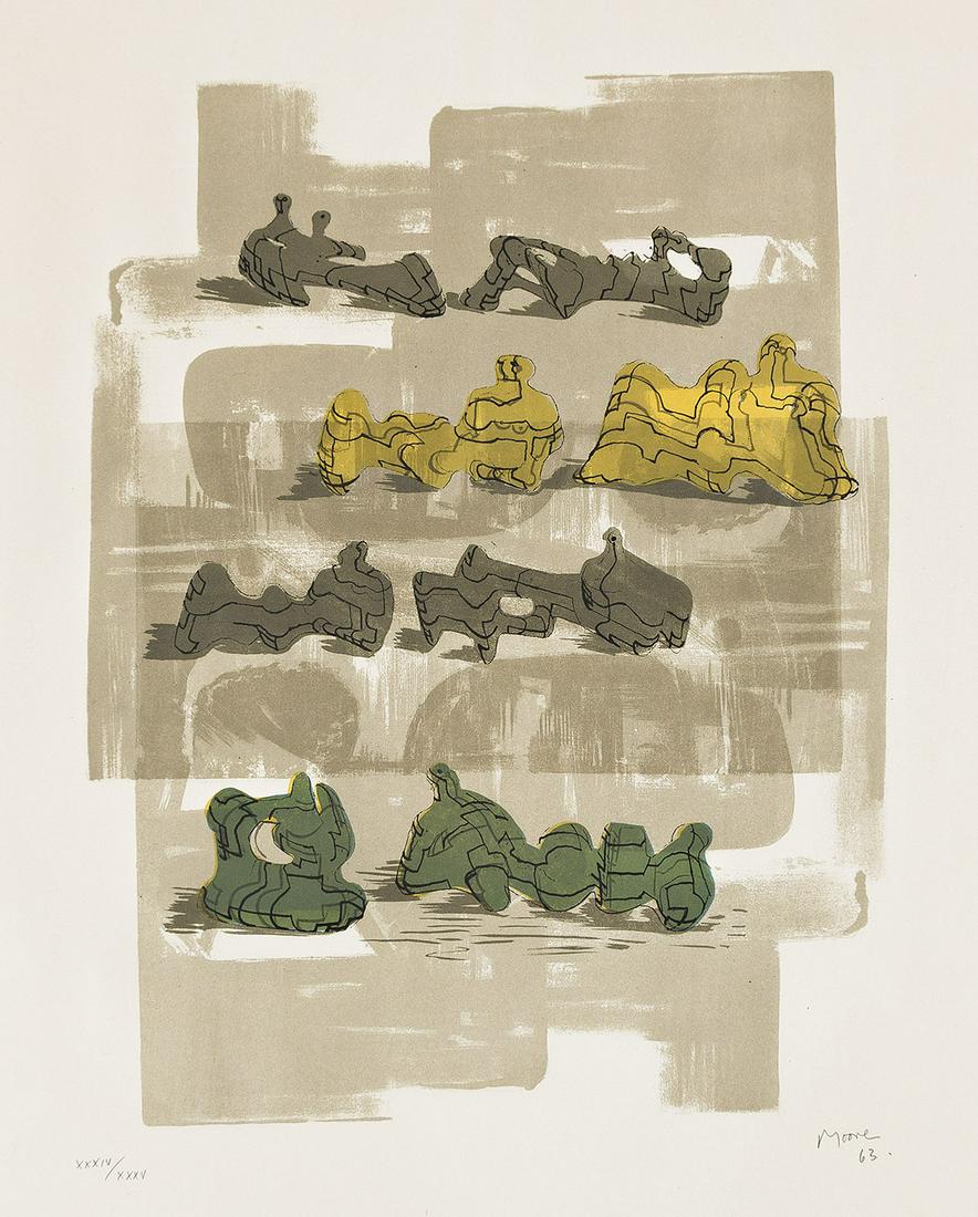 HENRY MOORE Eight Reclining Figures with Architectural Background.