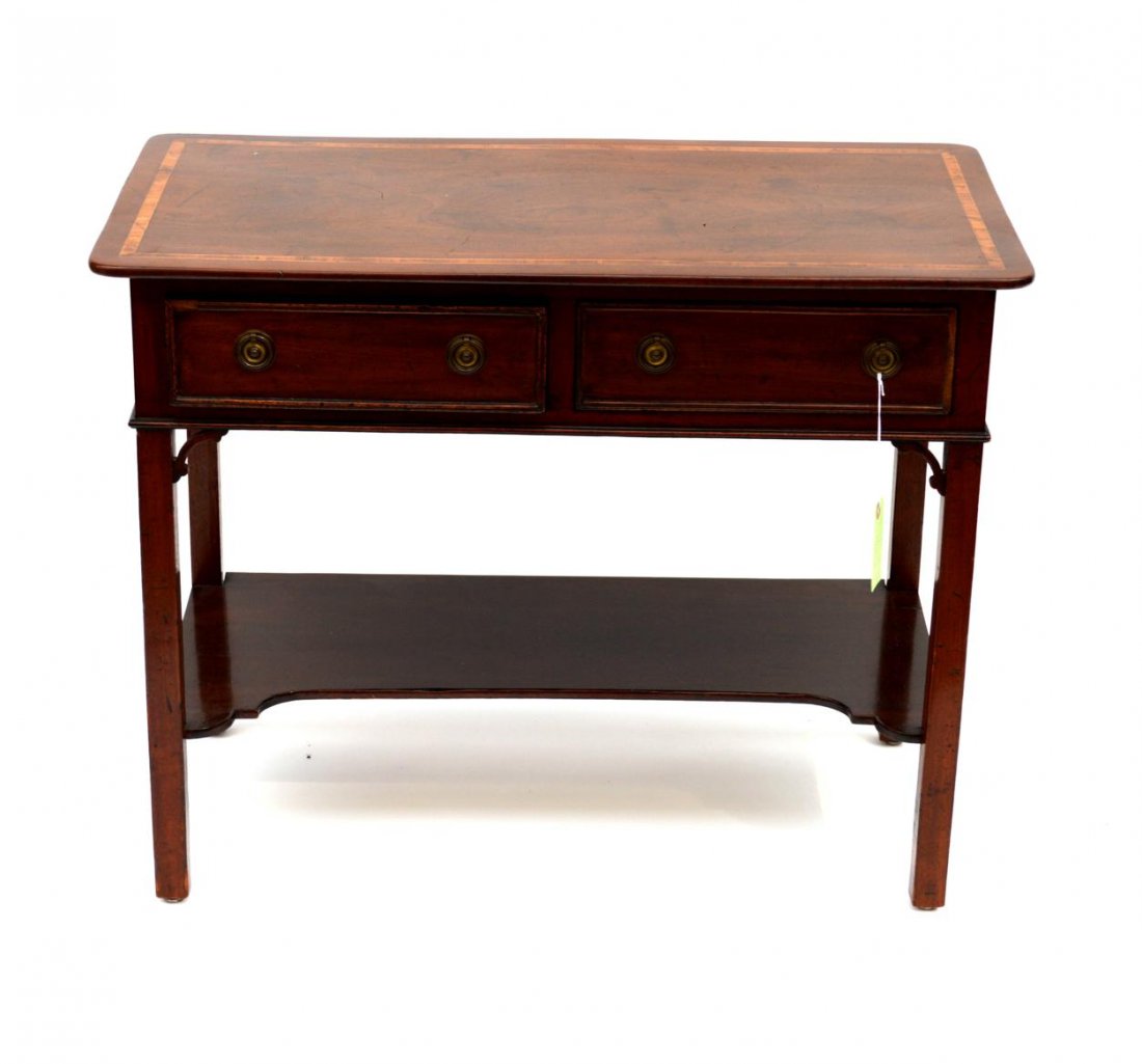 SoldENGLISH HEPPLEWHITE STYLE MAHOGANY CONSOLE TABLEEnglish Hepplewhite style mahogany hall table, late 20th c., having a shaped top, over two drawers, rising on tapered fluted legs, ending in blunt arrow feet, approx 28.5"h, 31.25"w, 13.25"d Start PriSee Sold Price