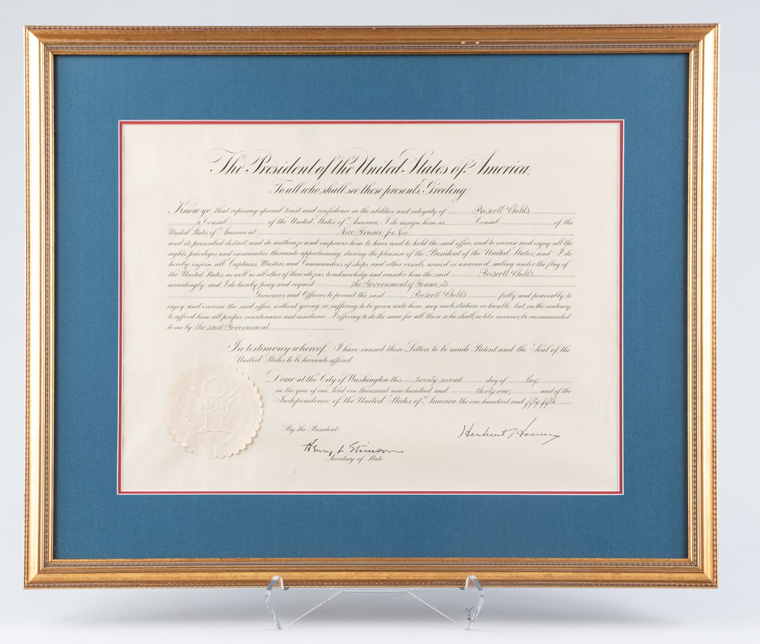 HERBERT HOOVER SIGNED FOREIGN SERVICE APPOINTMENT CERTIFICATE