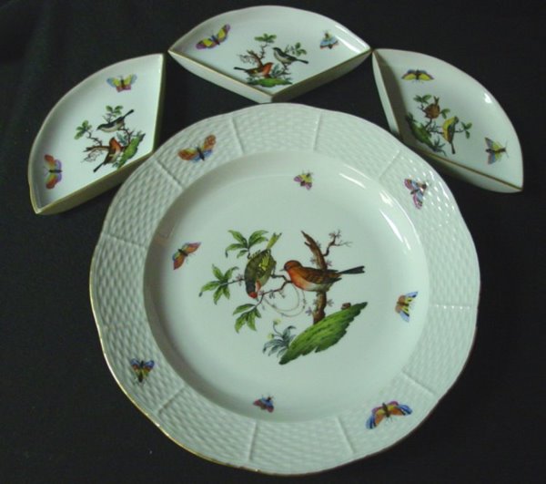 Sold2 Herend porcelain condiment or Hors D Oeuvres trays, 9.75" plate with three trays decorated with2 Herend porcelain condiment or Hors D Oeuvres trays, 9.75" plate with three trays decorated with birds & butterflies and a 14 3/8" tray with 5 hors D Oeuvres trays & center bown, birds & butterflies,See Sold Price