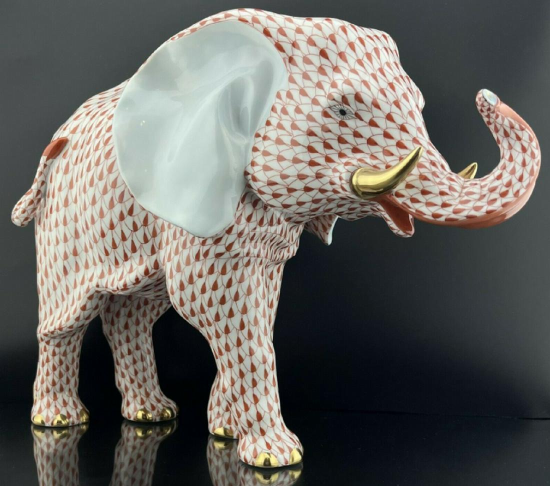 SoldLARGE HEREND RUST FISHNET STANDING ELEPHANT FIGUREHerend Hungarian hand painted porcelain sculpture of a standing elephant with rust red fishnet design and gilt accenting number 5214. Measures approx. 10" tall x 14" long.See Sold Price