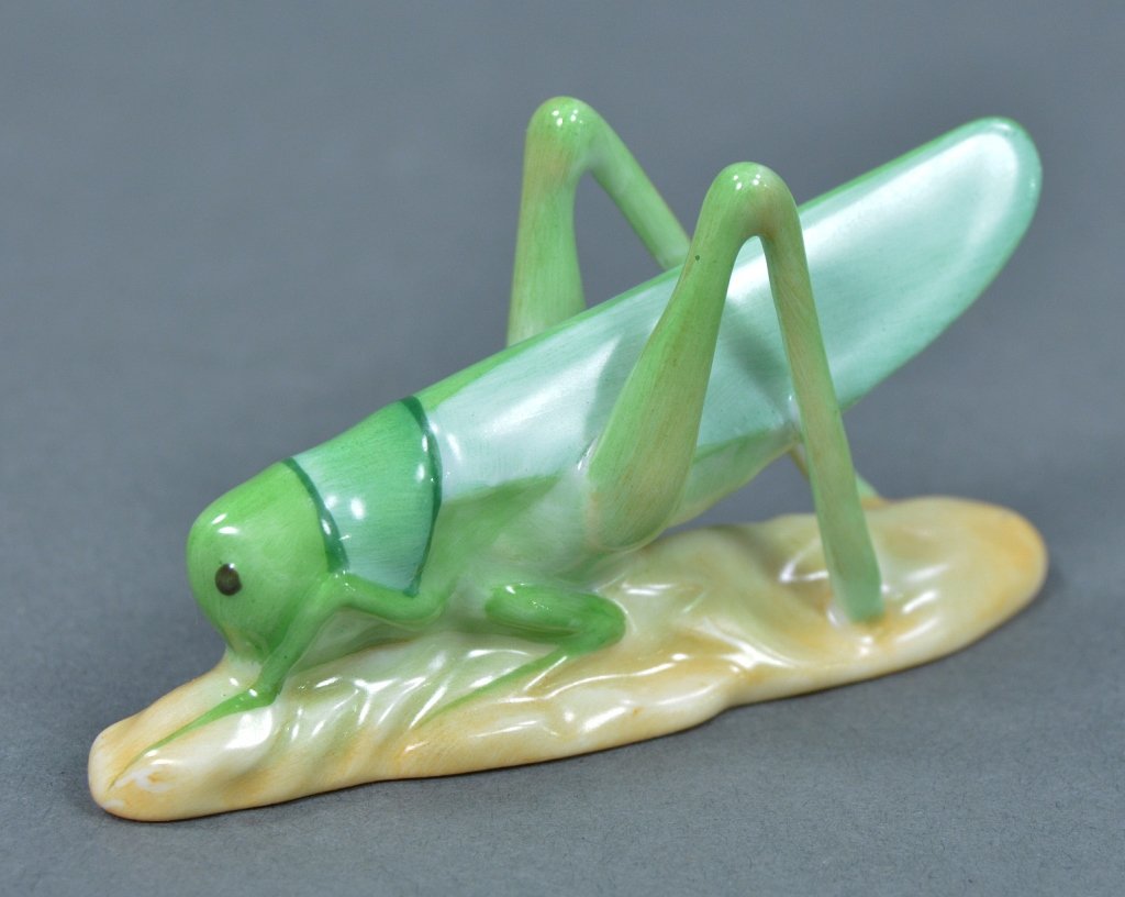 SoldHerend Porcelain Cricket FigurineDESCRIPTION: A Herend porcelain cricket figurine. Embellished with hand painted naturalistic accents. Marked along the underside with Herend stamps. CIRCA: Late 20th-21st ct. ORIGIN: Hungary DIMENSIONSee Sold Price