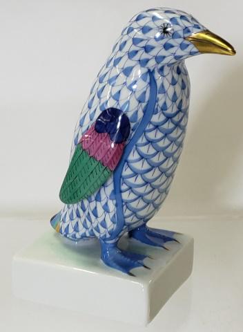 SoldHerend Porcelain Fishnet FigurineDESCRIPTION: A Herend porcelain penguin figurine embellished with green fishnet with multicolored wings and tail. Finished with gilded trim and accents. Stamped on the underside with Herend stamps. CISee Sold Price