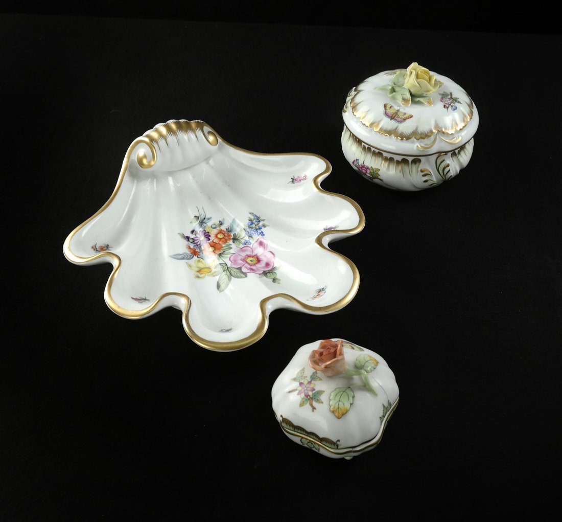 FRENCH LIMOGES PORCELAIN FLORAL / FRUIT MOTIF TABLE ARTICLES, LOT OF TEN9 hrs LeftA lot of three variously decorated cut crystal and opaline glass objectsFeb 24, 2026Vintage Hand Painted Ceramic Porcelain Bowls Plate2 days Left3 Vintage Retired China Floral Salad PlatesFeb 13, 2026(2pc) Herend Porcelain Pin Dish & Trinket BoxFeb 10, 2026Herend porcelain two handled centerpiece15 hrs LeftOyster Plates10 hrs LeftLimoges Painted Porcelain Tableware, 4 Pcs.Mar 12, 2026Wonderful "Herend" tea set and tray fruit and flowers. Estate fresh, hand painted and clean. No3 days LeftHand-Painted Porcelain Shell Dishes rose flower Hand-Painted Porcelain Shell Dishe ? Herend Style ?Feb 07, 2026Oyster Plates10 hrs LeftAntique German Porcelain, Urn, Footed Plates, Dresden, Schumann, More!11 hrs LeftAntique Ornate Ct Carl Tielsch Germany Floral Divided Handled Dish Herend StyleFabulous "Herend" large fruit and flower covered tureen and platter. Made in Hungary. Hand painted,3 days LeftAntique German Porcelain Meissen, Dresden Reticulated Candy Dishes11 hrs LeftMeissen, Germany. Two porcelain bowls hand-painted with polychrome flowers. Gold rim.