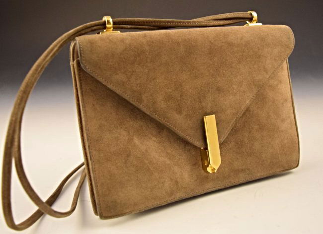 SoldVintage Hermes Suede & Leather HandbagVintage suede and leather handbag. Clio model circa 1970's. Black calfskin interior, gold tone hardware and handle retained by tubogas chain. Two interior compartments with two slip pockets, one snapSee Sold Price