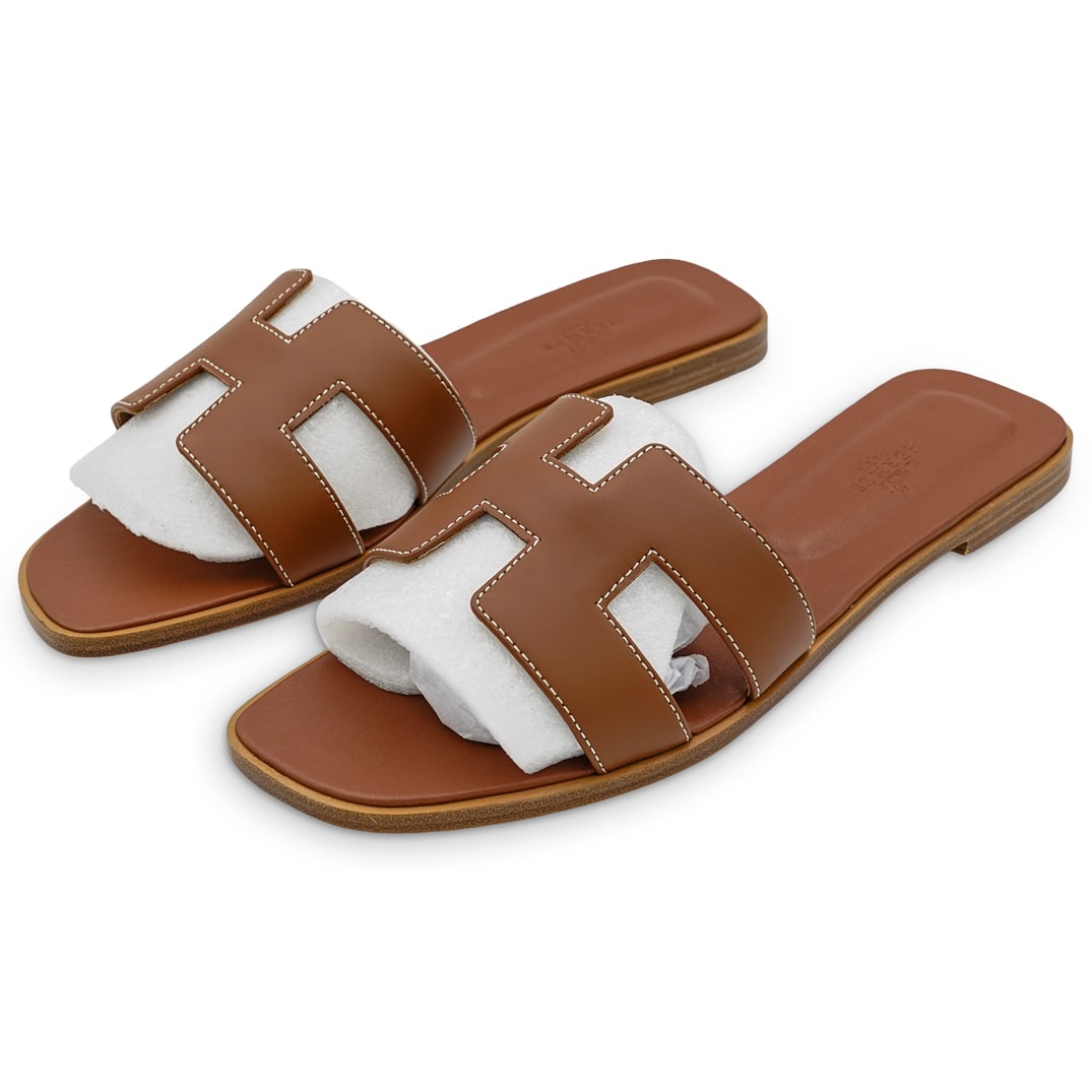 SoldHermes Oran SandalDESCRIPTION: This Hermes sandal is in box calfskin with an H cut-out. In color gold. Comes with original box, and dust bags CIRCA: 21st Century ORIGIN: Italy DIMENSIONS: Size 40 Have a similar item toSee Sold Price