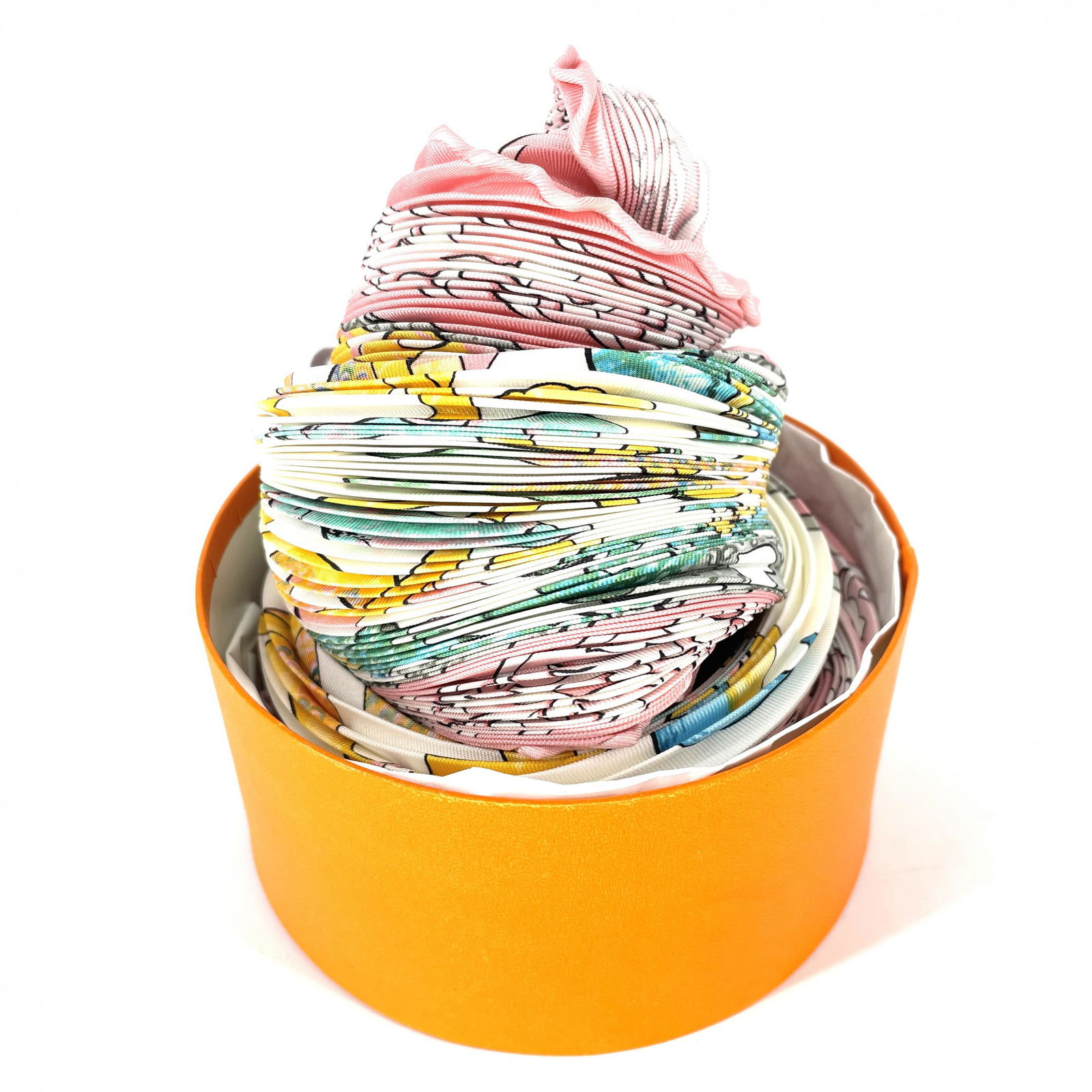SoldHERMES PLEATED SILK SCARF 'AU FIL DE LA SOIE'Hermes pleated silk twill scarf in "Au Fil de la Soie" pattern, original design by Annie Faivre, c. 1995, design representing the silk making process, retaining branded box and care tag, measurementsSee Sold Price