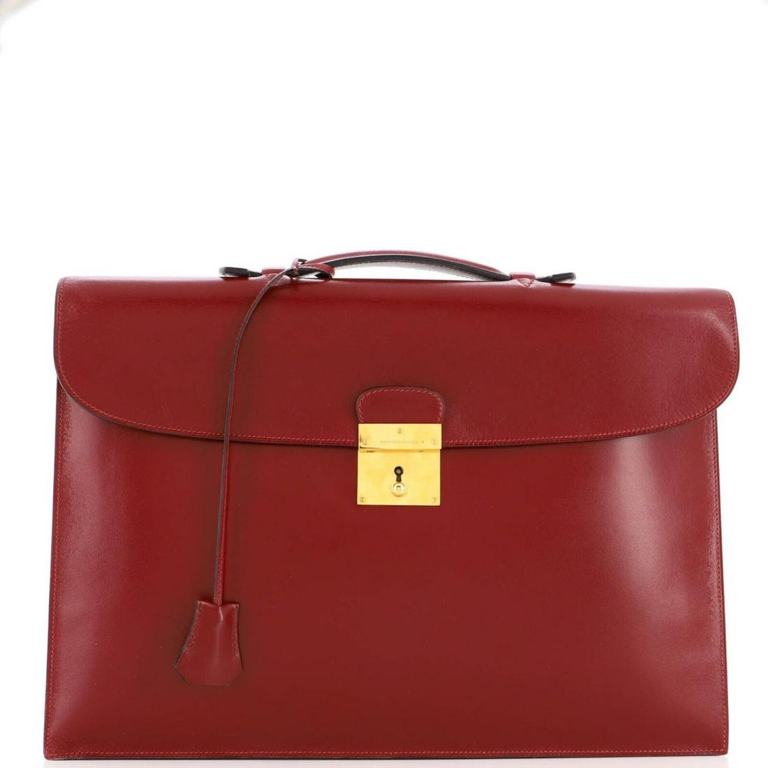 SoldHermes, Sac a depeches briefcaseHermes Sac a depeches briefcase France, 2002red box leather, gold-plated brass 12.5 h × 16 w × 2.5 d in (32 × 41 × 6 cm) Signed to buckle 'Hermes Paris' and to interiorSee Sold Price