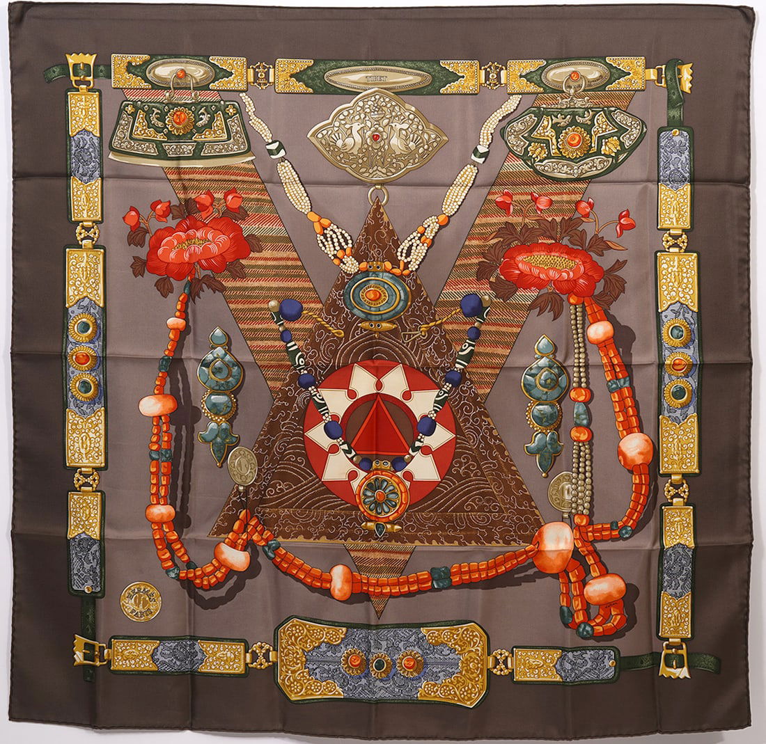 SoldHERMES SILK TWILL SCARF, 'TIBET' PATTERNHermes silk twill scarf, "Tibet" pattern, original design by Caty Latham, approx 35"l, 35"w Start Price: $100.00See Sold Price