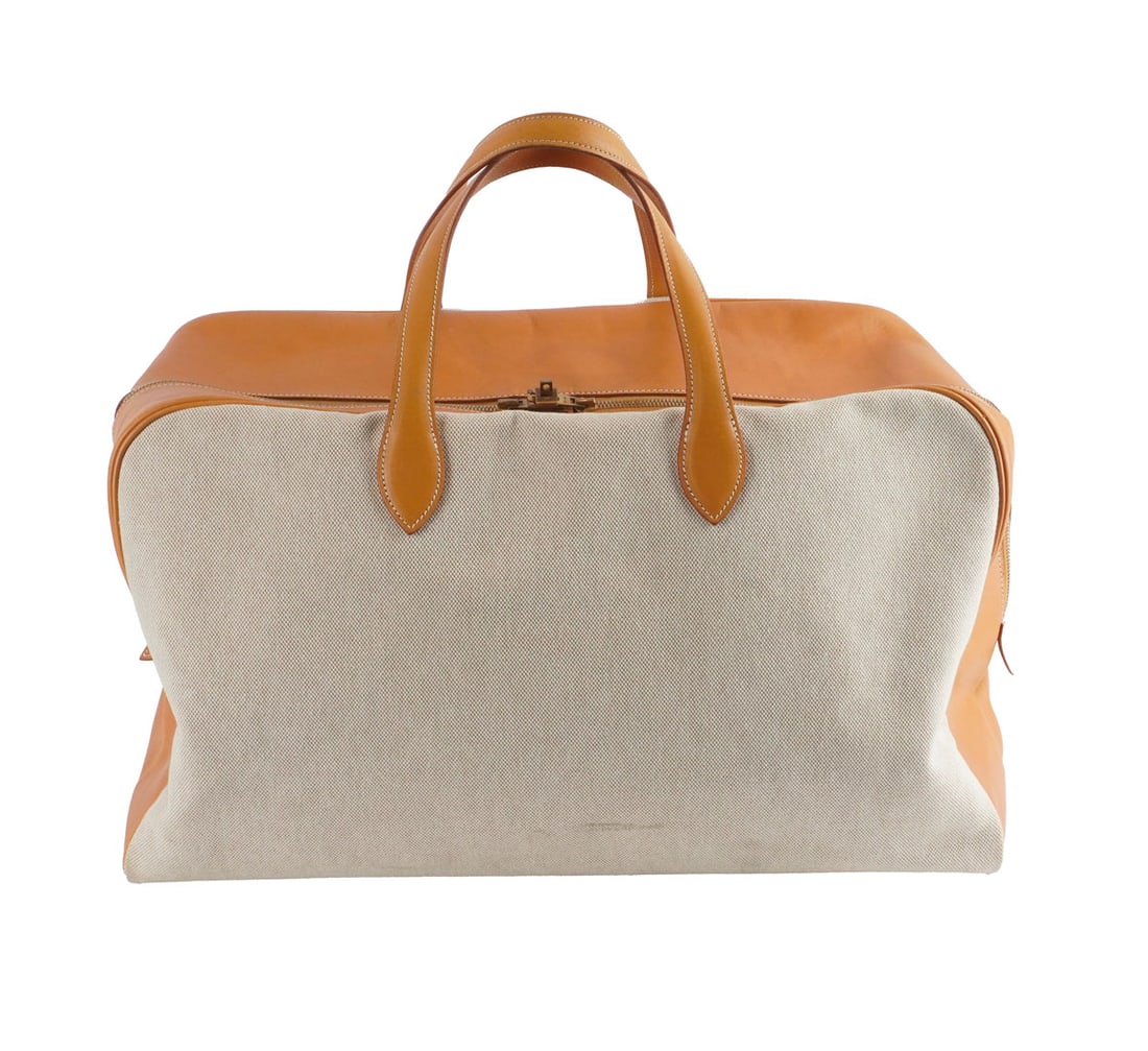 SoldHERMES VICTORIA DE VOYAGE TRAVEL BAGHermes cream woven canvas "Victoria de Voyage" bag with gold-tone hardware, chocolate brown leather trim, two rolled top handles, three sided zip opening, the beige fabric lined interior with two sepaSee Sold Price