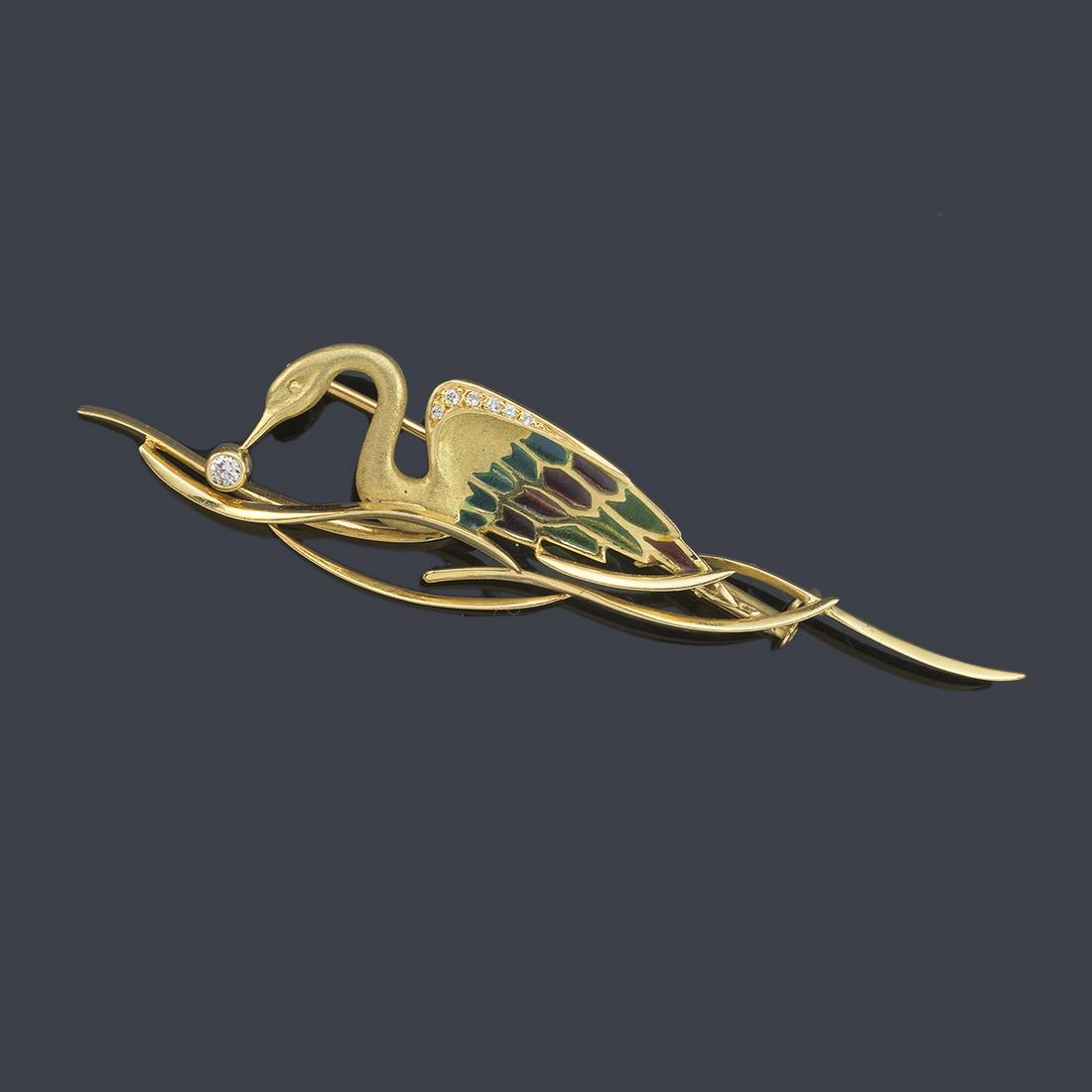 Heron-shaped brooch with polychrome 'plique-à