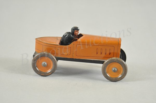 Sold1914 Hess German Tin Race Car Spider & Driverc.1914 Hess German Tin open auto with Driver. Pre-War Hess Spider. Flywheel friction drive run by front crank. Early automobile 6 1/4 inches long.See Sold Price