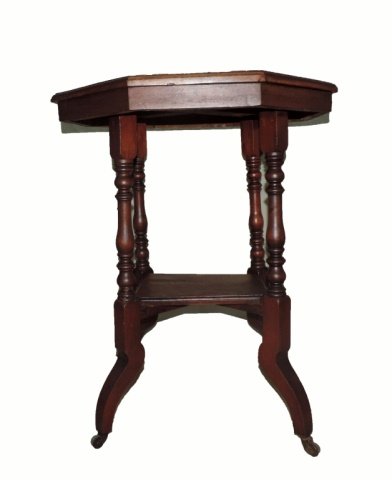 Victorian side table, American, 19th C., walnut, Aesthetic Movement, possibly Merklin Bros., hexagonVictorian side table, American, 19th C., walnut, Aesthetic Movement, possibly Merklin Bros., hexagon top molded edge, fluted conforming apron over six twist turned legs, upper double stretchers with m