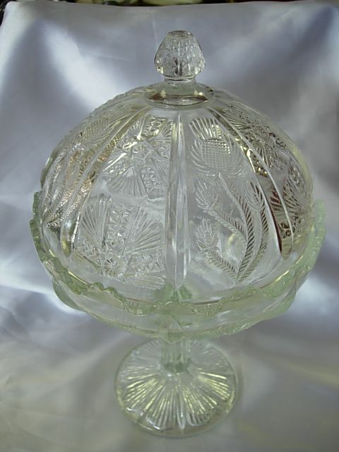 HIGBEE PRESSED GLASS THISTLE COMPOTE BEE LOGO
