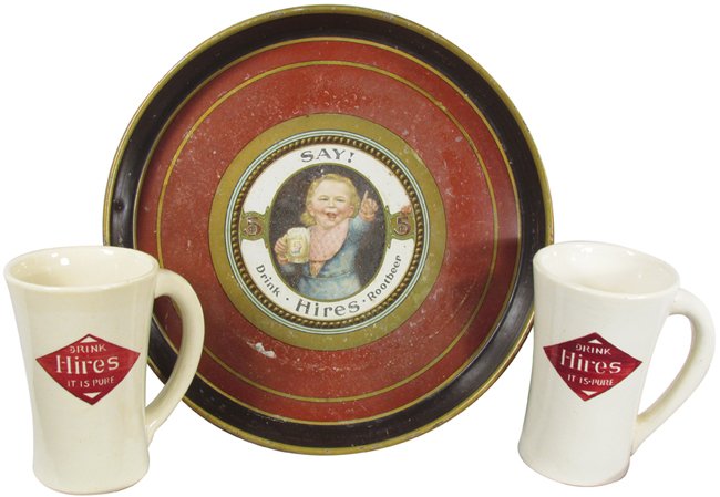 Hires Tin Serving Tray and Two Ceramic Mugs
