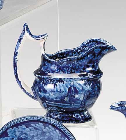 SoldHISTORICAL BLUE CREAMERHISTORICAL BLUE CREAMER DEPICTING COMMODORE MCDONOUGHS VICTORY ON LAKE CHAMPLAIN 1814 BY ENOCH WOOD, HANDLE REPAIRED 5 1/2 IN HSee Sold Price