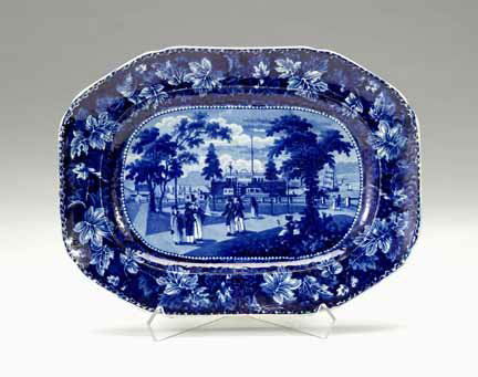 Historical Staffordshire transfer-ware platter "Palace of St. Cloud, France", by Ralph Hall of Swan Historical Staffordshire transfer-ware platter "Palace of St. Cloud, France", by Ralph Hall of Swan Bank Pottery Works, Tunstall, Stoke-on-Trent, England, c. 1830, cobalt blue transfer print on porcel