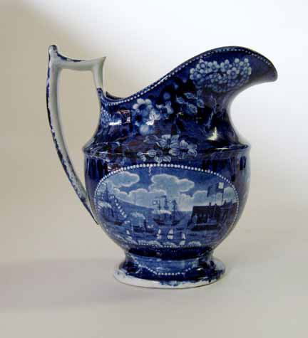 Historical blue transferware water pitcher, james