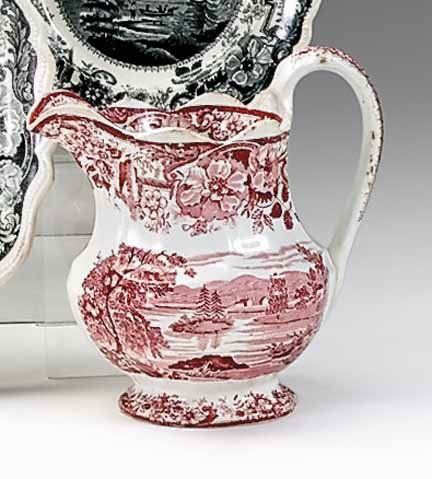 Historical pink transferware pitcher, clews, cobr