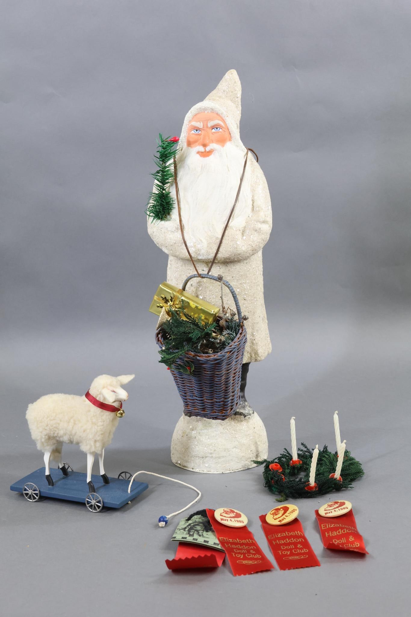 SoldHOLIDAY & NOVELTY.LOT of Holiday. 14 1/2" Santa by artist Rosemarie Snyder. Dressed in white clothing, he has a porcelain head, lower arms and legs. Mohair beard and hair. He is holding a lantern and small decorated trSee Sold Price