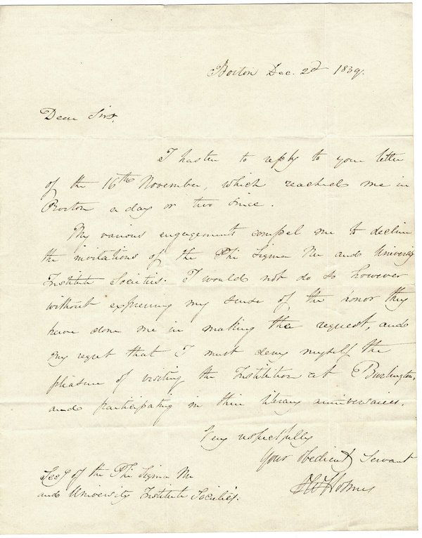 HOLMES, OLIVER WENDELL, Sr. - ALS, 1839