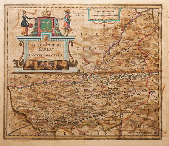 SoldA Henricus Hondius / Joannes Tardo Map, 1625Le Diocese De Sarlat Diocoesis Sarlatensis Delineabat Joannes Tardo, Caonieus Ecclesiac Sarlati 1625, hand colored. Dimensions:Sight is 15 1/2" x 20", the frame 22 1/2" x 27 1/2".See Sold Price