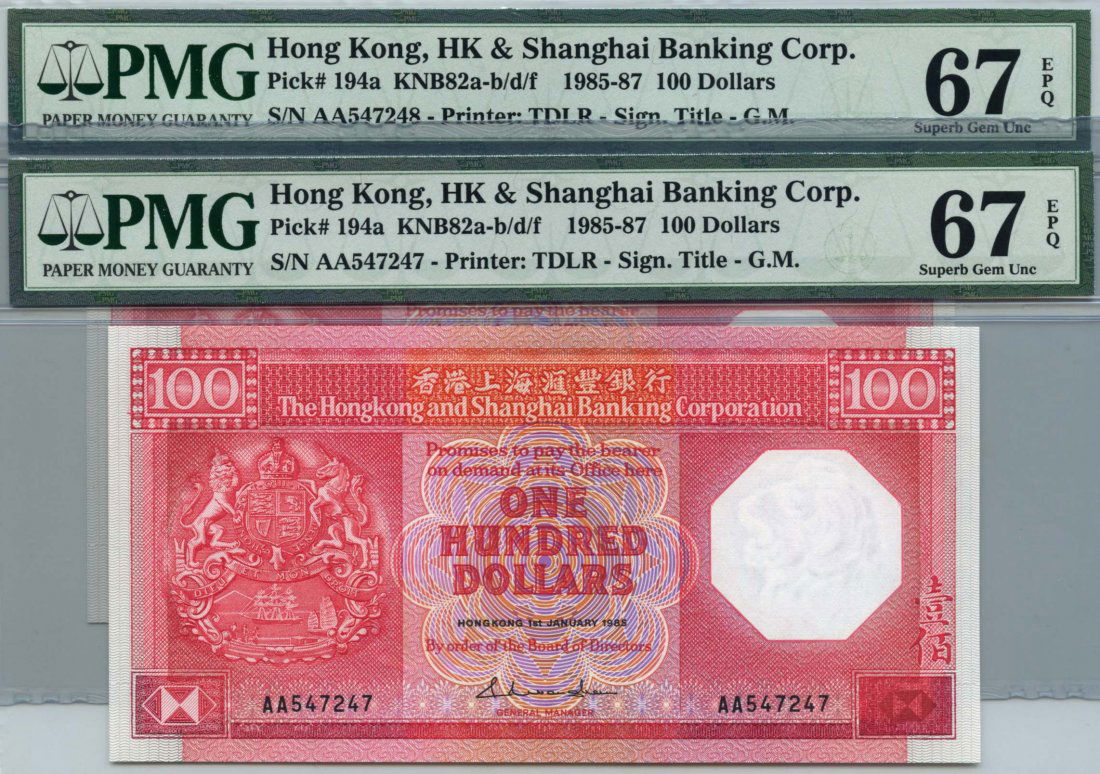 HONG KONG HSBC: $100 1985 Consecutive pair