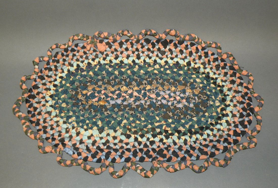 Sold3 table mats incl felt backed penny mat & 2 round braided rug mats - 22 1/2"x13", 14" & 10" diam3 table mats incl felt backed penny mat & 2 round braided rug mats - 22 1/2"x13", 14" & 10" diamSee Sold Price