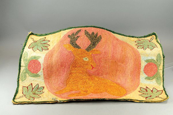 SoldHooked rug of 2 standing deer including a stag and doe,Hooked rug of 2 standing deer including a stag and doe, very good condition. 39" x 20". According to family, this rug was hooked in Nova Scotia, mid 20th century.See Sold Price