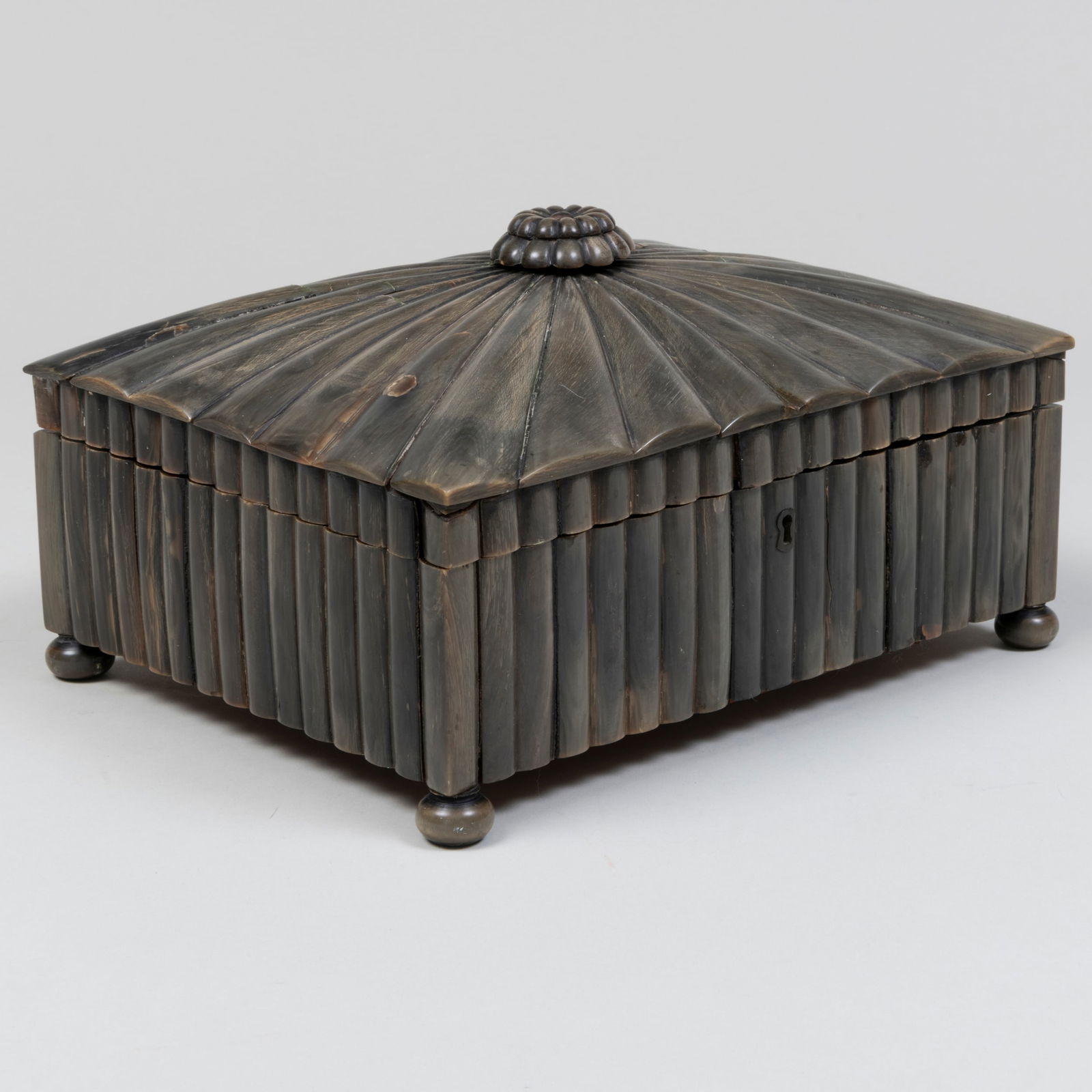 SoldHorn Veneered Storage BoxThe table casket with large tessellated panes. [6 x 10 1/4 x 6 1/4 inches]. Cracking and lifting to panels.See Sold Price