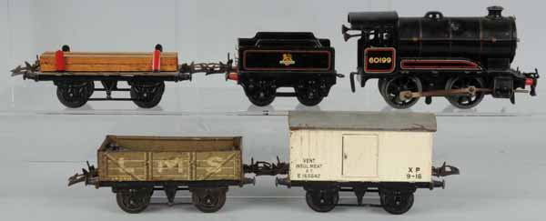 SoldHornby, "O" Gauge Toy Train SetEnglish. Pressed steel, lithographed tin. Includes two engines, five cars and an assortment of various shapes of track and lithographed tin accessories. Many pieces remain in their original boxes. BoxSee Sold Price
