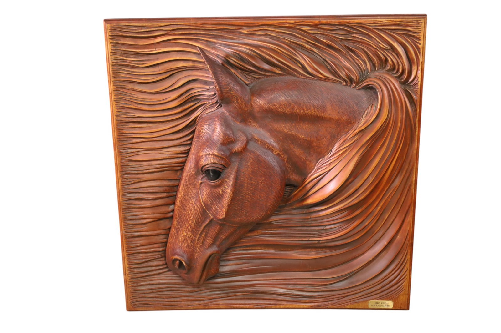 SoldHORSE PLAQUELARGE WOODEN HORSE PLAQUE, IN RELIEF. MARKED ON REVERSE, BILL CHURCHILL, BIG RED, 1994. 35" x 36" THIS ITEM EXCEEDS SIZE OR WEIGHT LIMITATIONS FOR IN HOUSE SHIPPING, MUST BE PICKED UP VIA 3rd PARTY GRSee Sold Price