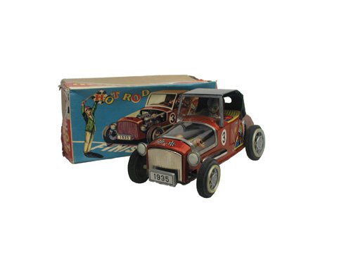 SoldBOXED MASUDAYA SUPER HOT ROD66. BOXED MASUDAYA SUPER HOT ROD | Battery-operated. | 9" l. | Lid has some edge tears, box bottom torn on one end flap, toy is bright in (Excellent to Pristine Condition) | $300 - $600See Sold Price
