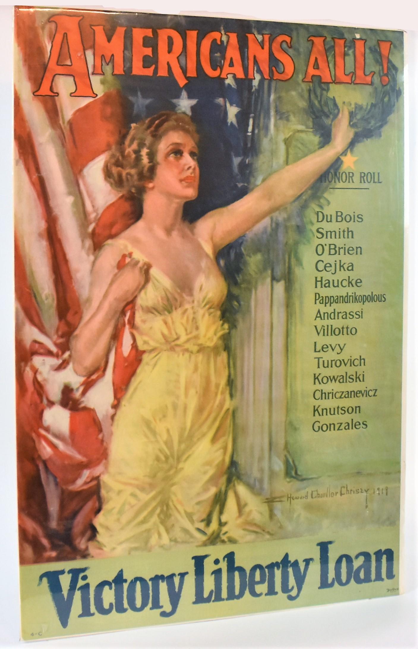 SoldHoward Chandler Christy WWI Lithograph PosterHoward Chandler Christy Americans All! Victory Liberty Loan World War I Lithograph Poster, circa 1919. 39" by 27", visible repair, creasing and tears, tear lower left. Allegorical female figure of AmeSee Sold Price