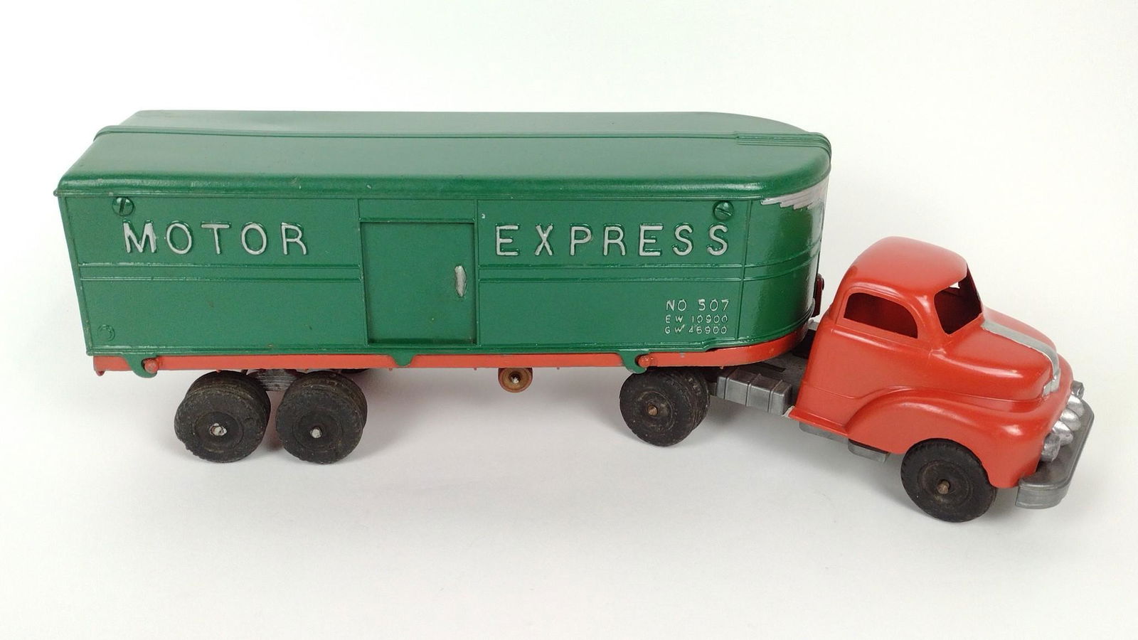 SoldHubley Toy 1930s Motor Express #2287 Cast Iron Red Green Semi Truck And TrailerHubley Toy 1930s Motor Express #2287 Cast Iron Red Green Semi Truck And Trailer Vivid and nostalgic, this Hubley â€Å“Motor Expressâ€? cast iron toy features a red cab and green streamlinedSee Sold Price