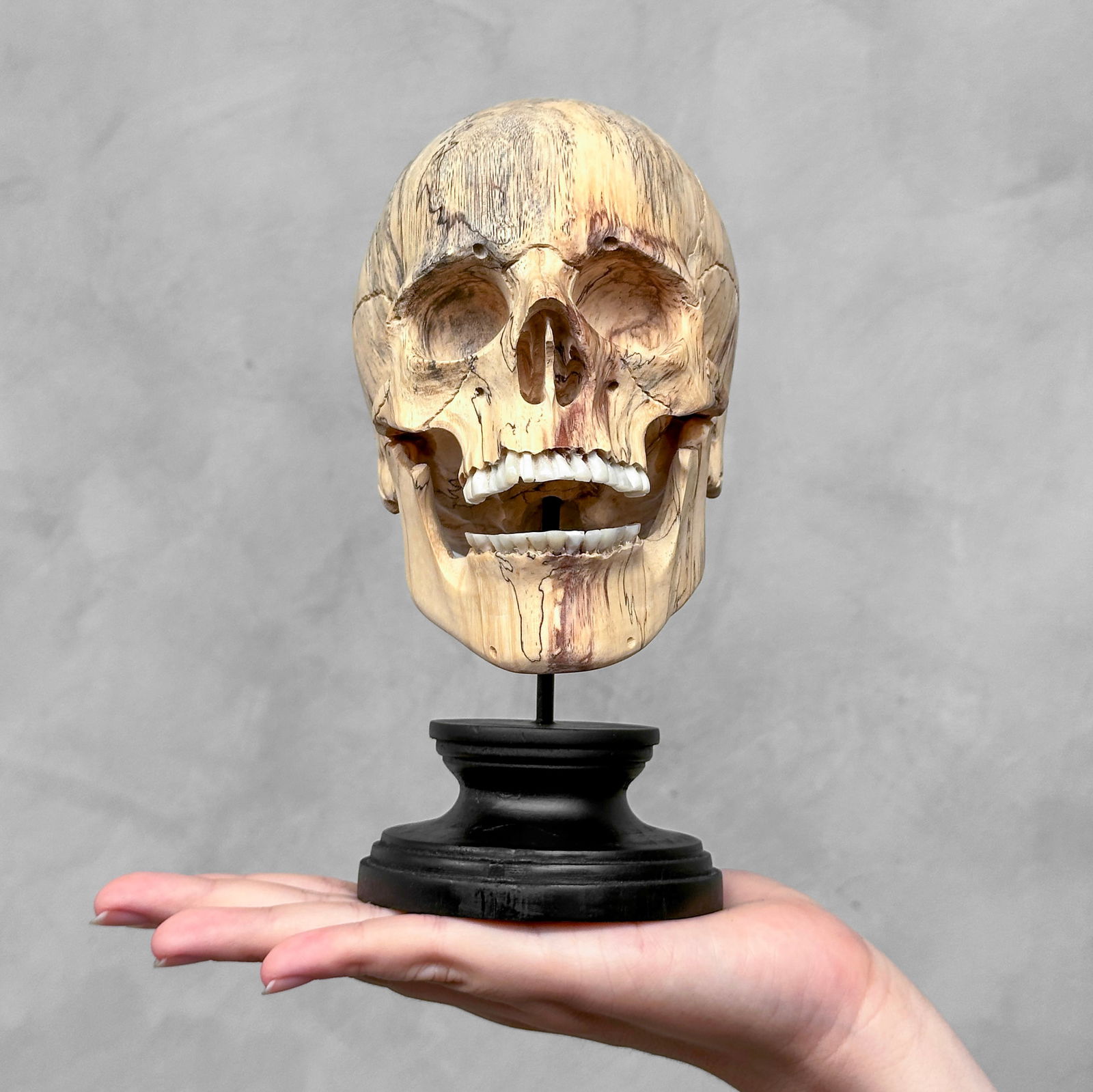 Wonderful human skull with a beautiful grain on a custom stand
