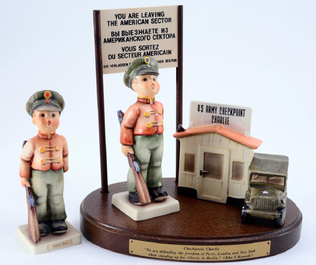 SoldGoebel Hummel Figurine, Checkpoint CharlieLimited edition, hand painted in matte finish. Commemorative edition symbolizing the Cold War, featuring the figurine Soldier Boy standing next to the Checkpoint Charlie replica with U.S military car.See Sold Price