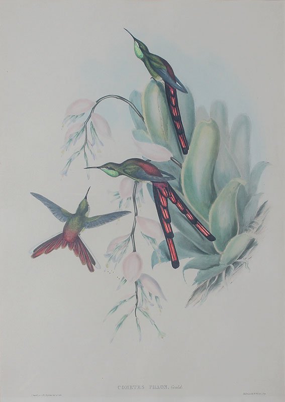 SoldGroup,4 Gould & Richter Hummingbird LithographsJohn Gould (English, 1804-1881) and Henry Constantine Richter (English, 1821-1902) Group of four: Docimastes ensiferus (Sword-billed Hummingbird), Anthus Arboreus (Tree Pipit), Aphantochroa Gularis -See Sold Price