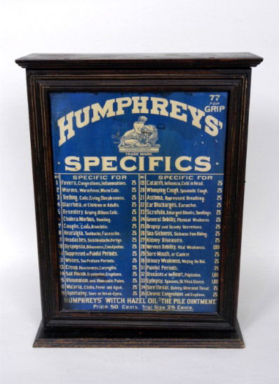 SoldHumphreys' Specifics Medicine Display Cabinet1940s Great Piece o ountry soe/medical advertising, Humphreys' Specifics Medicine Display Cabinet. Condition VG+. Size: 27 5/8 T X 21 3/4 W X 9 5/8 DSee Sold Price