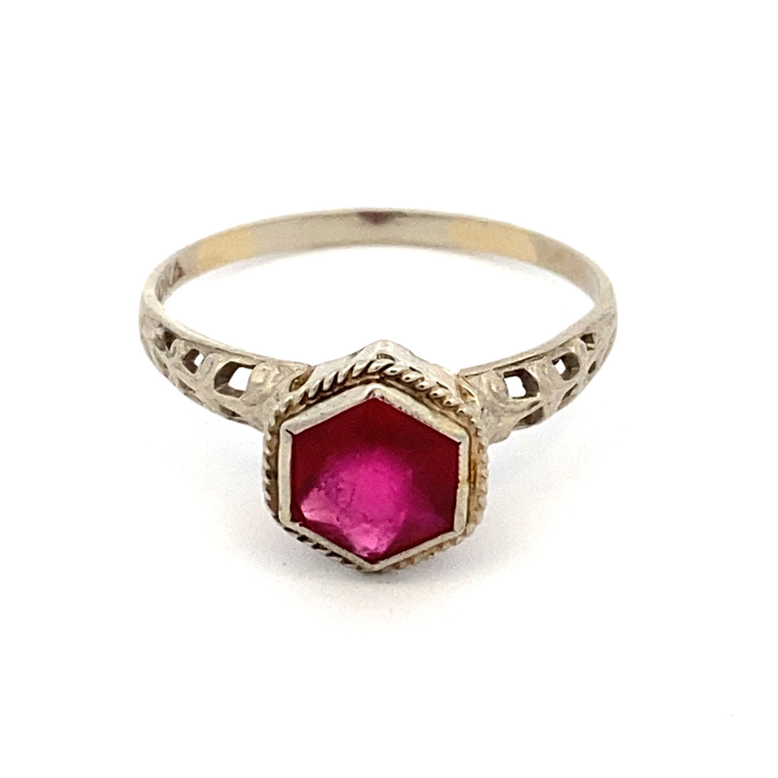SoldEsate Imitation Ruby Filigree Ring in 10K White GoldCirca: Estate, Metal type: 10K White Gold, Stone: Imitation ruby, Design: Filigree ring, Size: 3.75, Weight: 3.5 gSee Sold Price